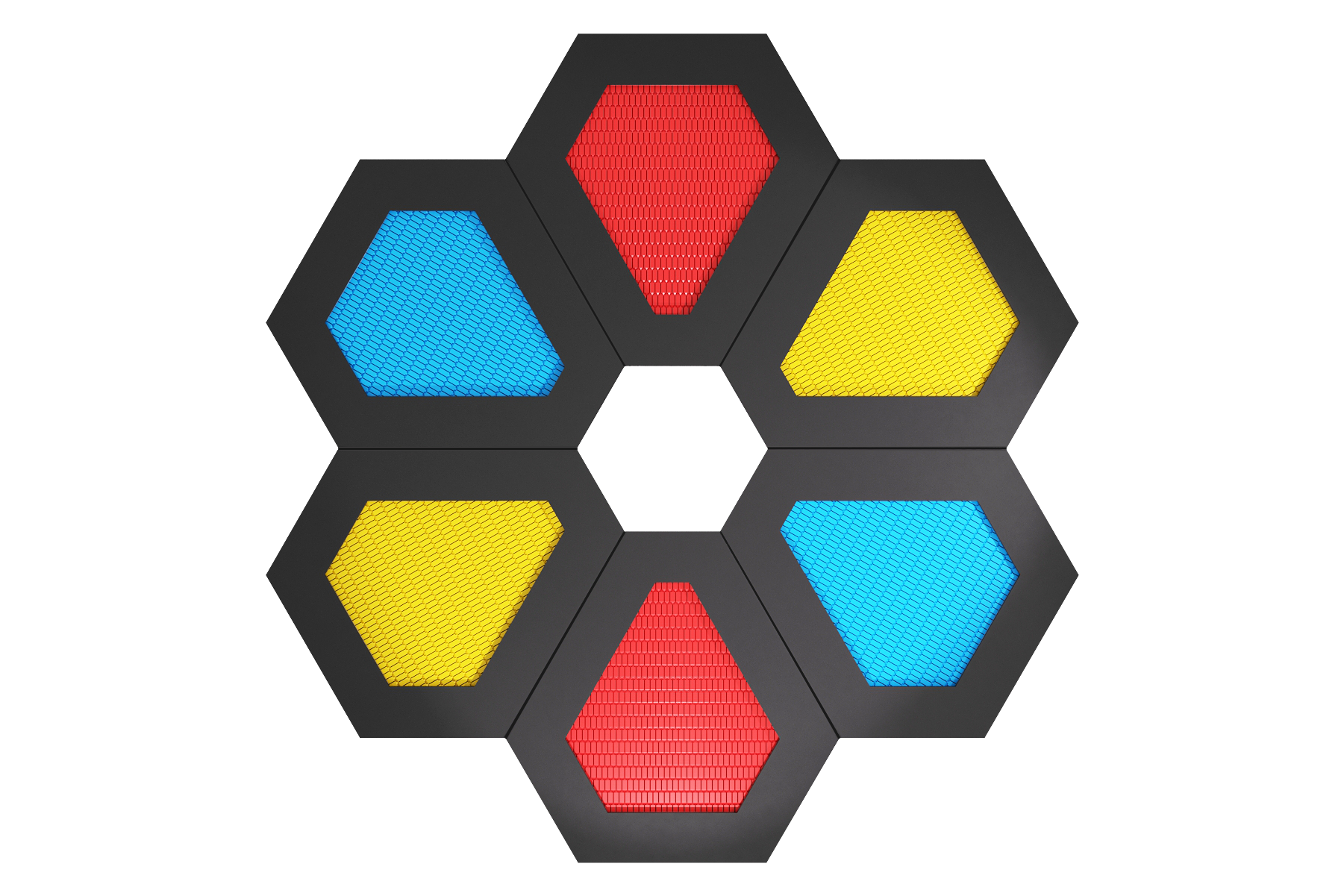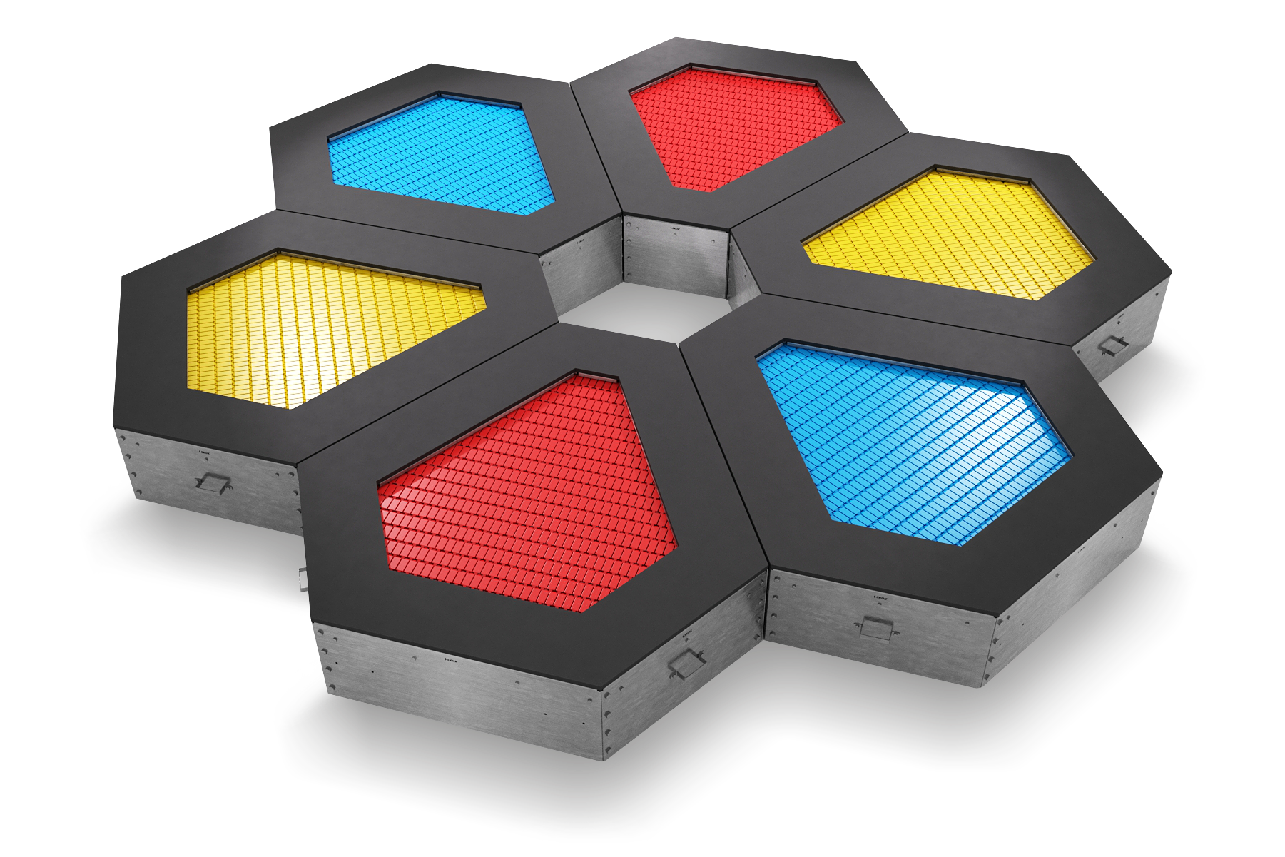 Набор встраиваемых батутов "Калейдоскоп 6S" состоит из шести батутов Сектор 6S. На такой комплектации одновременно могут прыгать до 6х человек. Все шесть встраиваемых батутов могут быть выполнены в 5 различных цветах: с зеленым, красным, черным, синим или желтым прыжковым полотном. Набор подходит для использования на детских площадках, парках, улицах и бульварах.
