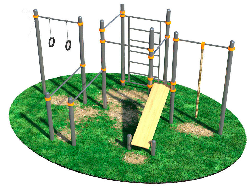 5-ти перекладин турник, 2-х перекладин лавка, листа влагостойкой окрашенной двухкомпонентной краской фанеры толщина 24мм скругленный по форме (450ммх1800мм), секции лавка, секции лестница, 2-х перекладин брусья. Крепеж фанеры осуществляется полухомутами к горизонтальным перекладинам лавка. Крепеж перекладин к вертикальным опорным столбам осуществляется при помощи хомутов. Монтажные схемы сборки и установки спортивного оборудования, а так же сертификат соответствия и паспорт на изделие в обязательном порядке прилагаются в комплекте.