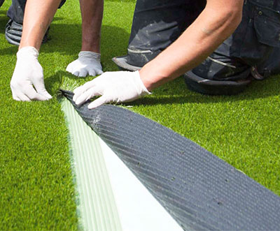 К склеиванию полотен покрытия необходимо приступать после подрезки кромок. Это позволит предотвратить деформацию из-за суточной смены температур. Так же нужно убедиться, что все раскатанные рулоны лежат ровно, на поверхности нет бугорков и складок, а края раскатанной травы прилегают друг к другу вплотную. Для склейки применяют полиуретановый клей (двухкомпонентный) и специальную шовную ленту. Обычно стандартная ширина ленты 30 см. Клей наносится шириной 20 - 25 см. Средний расход состава составляет 350-450 г/п.м. Для склеивания следует развернуть края полотен и раскатать шовную ленту так, чтобы стык располагался по середине ленты. Клей на ленту наносится зубчатым шпателем. Затем края рулонов искусственной травы аккуратно опускаются на ленту и прикатываются при помощи катка.